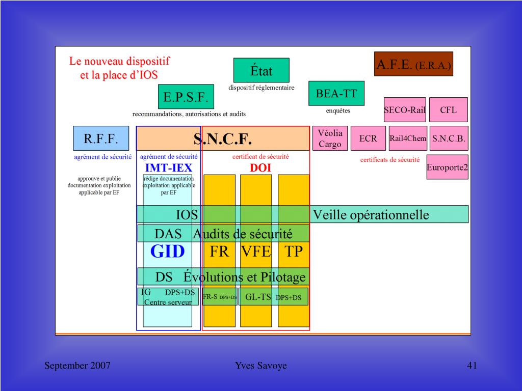 Seega vastutavad Prantsusmaal raudteesüsteemi ohutuse järelvalve eest ametlikult Infrastruktuuri Juhid(GI), kuid tegelikult tagab selle Riiklik Raudteeühing (SNCF), kelle ülesandeks on GI-d informeerida Yves Savoye