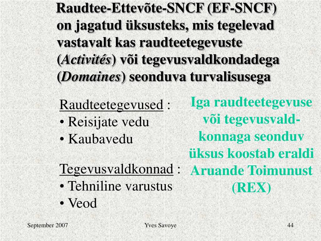 Raudtee-Ettevõte-SNCF (EF-SNCF) on jagatud üksusteks, mis tegelevad vastavalt kas raudteetegevuste (Activités) või tegevusvaldkondadega (Domaines) seonduva turvalisusega Igaraudteetegevuse või tegevusvald-konnaga seonduv üksus koostab eraldi Aruande Toimunust(REX) • Raudteetegevused : • Reisijate vedu • Kaubavedu • Tegevusvaldkonnad : • Tehniline varustus • Veod Yves Savoye