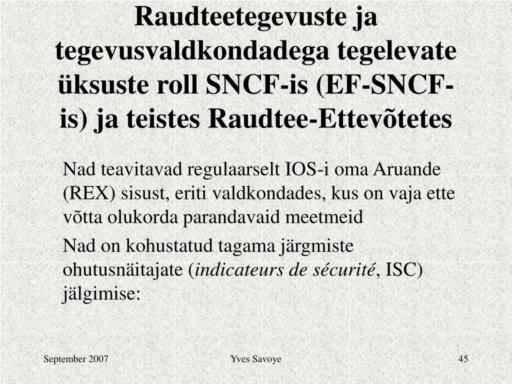 Raudteetegevuste ja tegevusvaldkondadega tegelevate üksuste roll SNCF-is (EF-SNCF-is) ja teistes Raudtee-Ettevõtetes Nad teavitavad regulaarselt IOS-i oma Aruande (REX) sisust, eriti valdkondades, kus on vaja ette võtta olukorda parandavaid meetmeid Nad on kohustatud tagama järgmiste ohutusnäitajate (indicateurs de sécurité, ISC) jälgimise: Yves Savoye