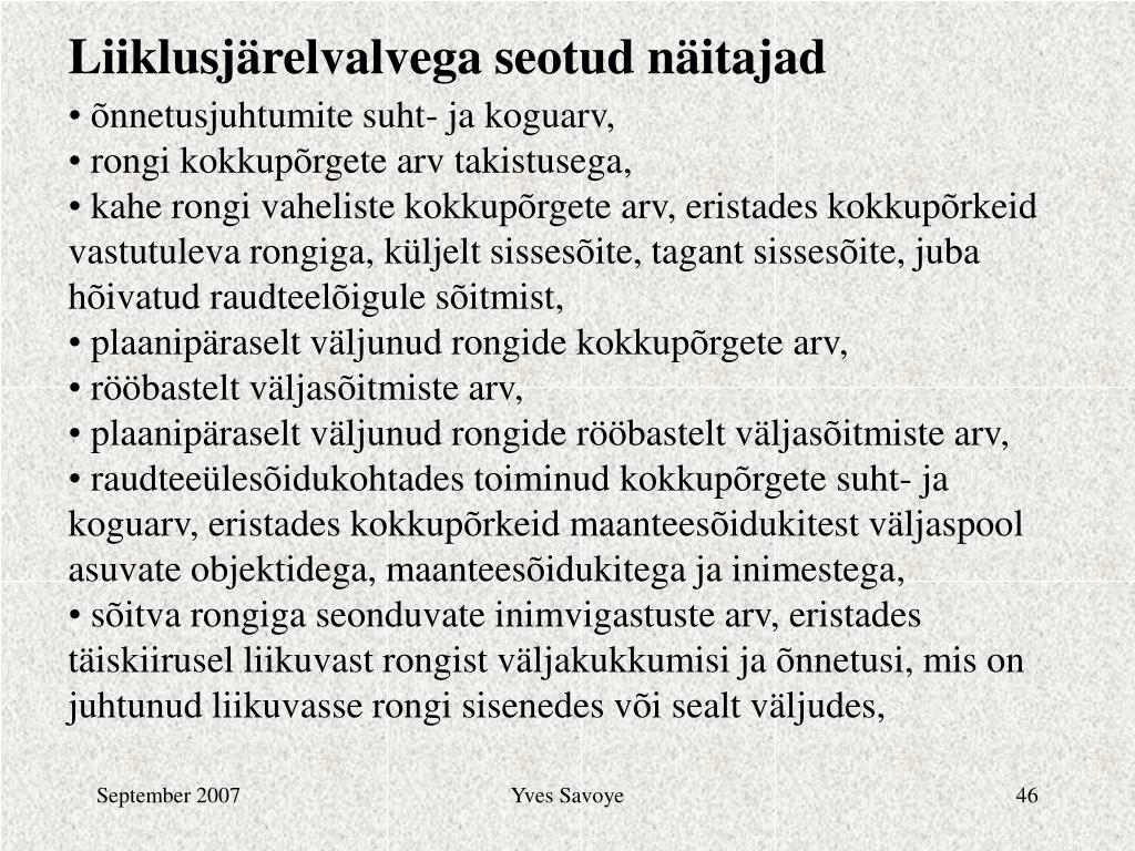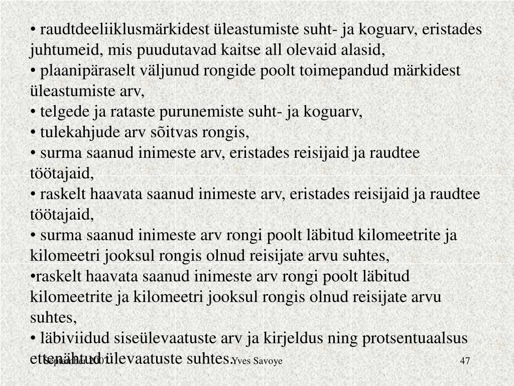 Liiklusjärelvalvega seotud näitajad • õnnetusjuhtumite suht- ja koguarv, • rongi kokkupõrgete arv takistusega, • kahe rongi vaheliste kokkupõrgete arv, eristades kokkupõrkeid vastutuleva rongiga, küljelt sissesõite, tagant sissesõite, juba hõivatud raudteelõigule sõitmist, • plaanipäraselt väljunud rongide kokkupõrgete arv, • rööbastelt väljasõitmiste arv, • plaanipäraselt väljunud rongide rööbastelt väljasõitmiste arv, • raudteeülesõidukohtades toiminud kokkupõrgete suht- ja koguarv, eristades kokkupõrkeid maanteesõidukitest väljaspool asuvate objektidega, maanteesõidukitega ja inimestega, • sõitva rongiga seonduvate inimvigastuste arv, eristades täiskiirusel liikuvast rongist väljakukkumisi ja õnnetusi, mis on juhtunud liikuvasse rongi sisenedes või sealt väljudes, Yves Savoye