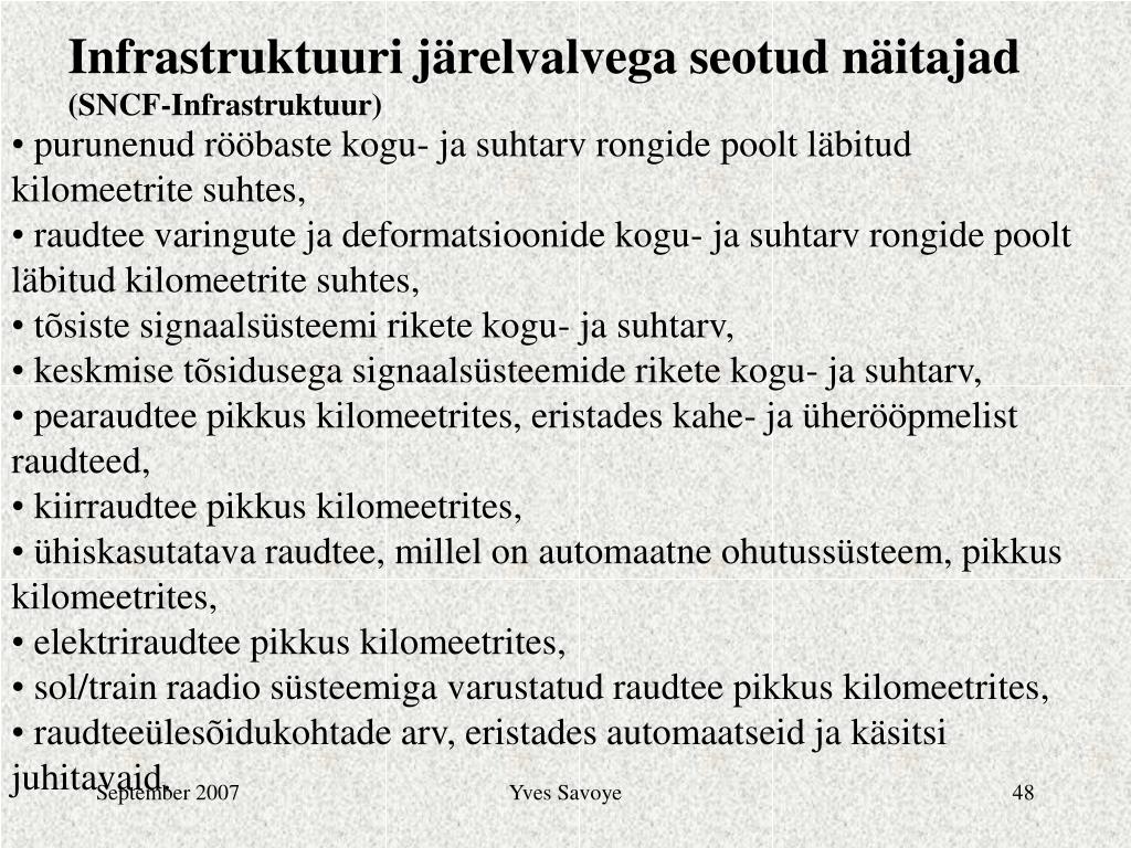 Infrastruktuuri järelvalvega seotud näitajad (SNCF-Infrastruktuur) • purunenud rööbaste kogu- ja suhtarv rongide poolt läbitud kilomeetrite suhtes, • raudtee varingute ja deformatsioonide kogu- ja suhtarv rongide poolt läbitud kilomeetrite suhtes, • tõsiste signaalsüsteemi rikete kogu- ja suhtarv, • keskmise tõsidusega signaalsüsteemide rikete kogu- ja suhtarv, • pearaudtee pikkus kilomeetrites, eristades kahe- ja üherööpmelist raudteed, • kiirraudtee pikkus kilomeetrites, • ühiskasutatava raudtee, millel on automaatne ohutussüsteem, pikkus kilomeetrites, • elektriraudtee pikkus kilomeetrites, • sol/train raadio süsteemiga varustatud raudtee pikkus kilomeetrites, • raudteeülesõidukohtade arv, eristades automaatseid ja käsitsi juhitavaid. Yves Savoye