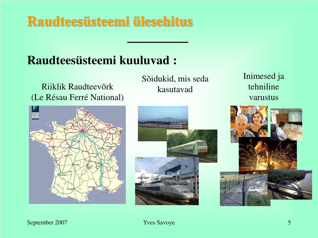 Raudteesüsteemi ülesehitus Raudteesüsteemi kuuluvad : Inimesed ja tehniline varustus Sõidukid, mis seda kasutavad Riiklik Raudteevõrk (Le Résau Ferré National) Yves Savoye