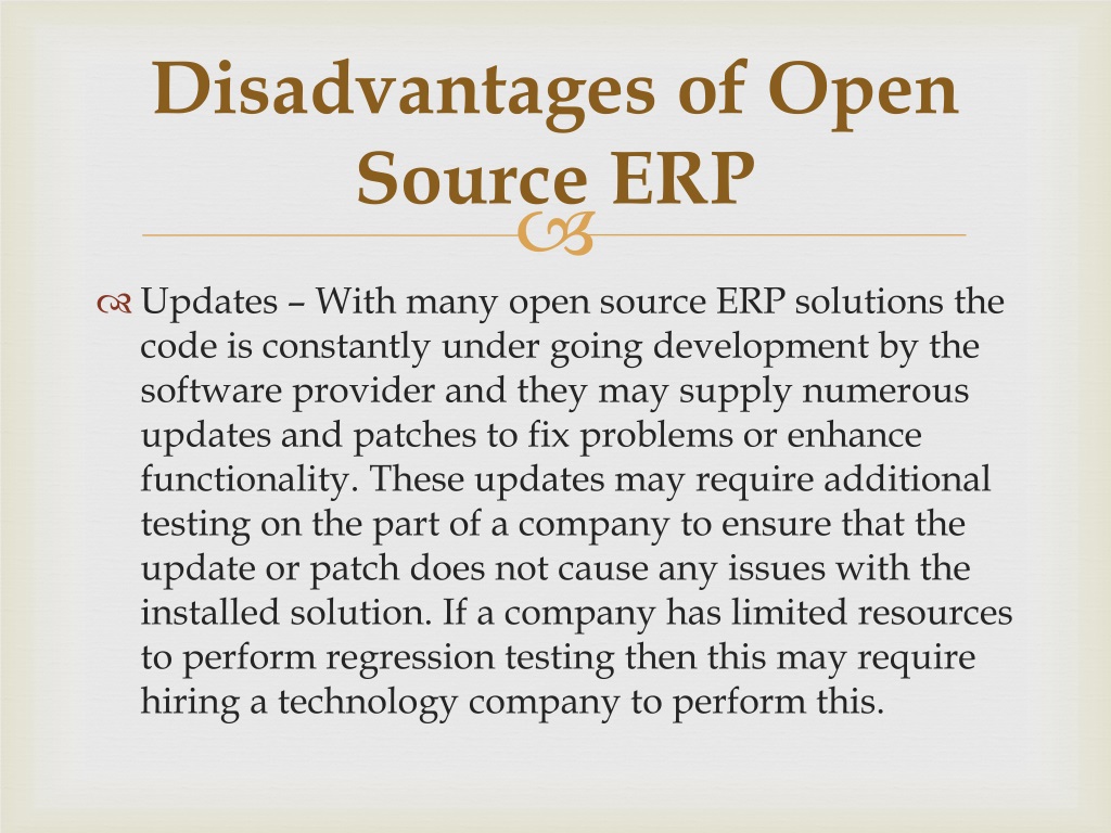 Disadvantages of Open Source ERP • Updates – With many open source ERP solutions the code is constantly under going development by the software provider and they may supply numerous updates and patches to fix problems or enhance functionality. These updates may require additional testing on the part of a company to ensure that the update or patch does not cause any issues with the installed solution. If a company has limited resources to perform regression testing then this may require hiring a technology company to perform this.