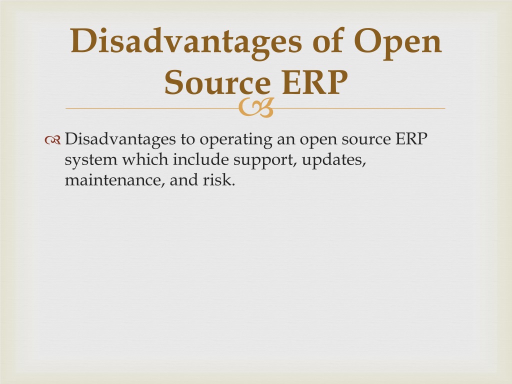 Disadvantages of Open Source ERP • Disadvantages to operating an open source ERP system which include support, updates, maintenance, and risk.