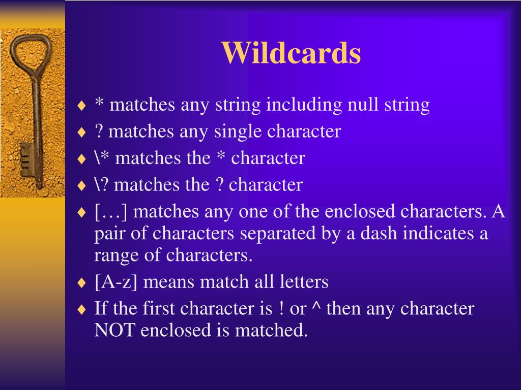 Wildcards • * matches any string including null string • ? matches any single character • \* matches the * character • \? matches the ? character • […] matches any one of the enclosed characters. A pair of characters separated by a dash indicates a range of characters. • [A-z] means match all letters • If the first character is ! or ^ then any character NOT enclosed is matched.