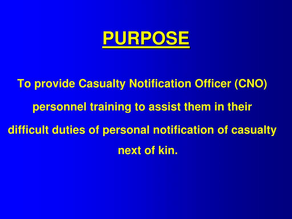 PURPOSE To provide Casualty Notification Officer (CNO) personnel training to assist them in their difficult duties of personal notification of casualty next of kin.