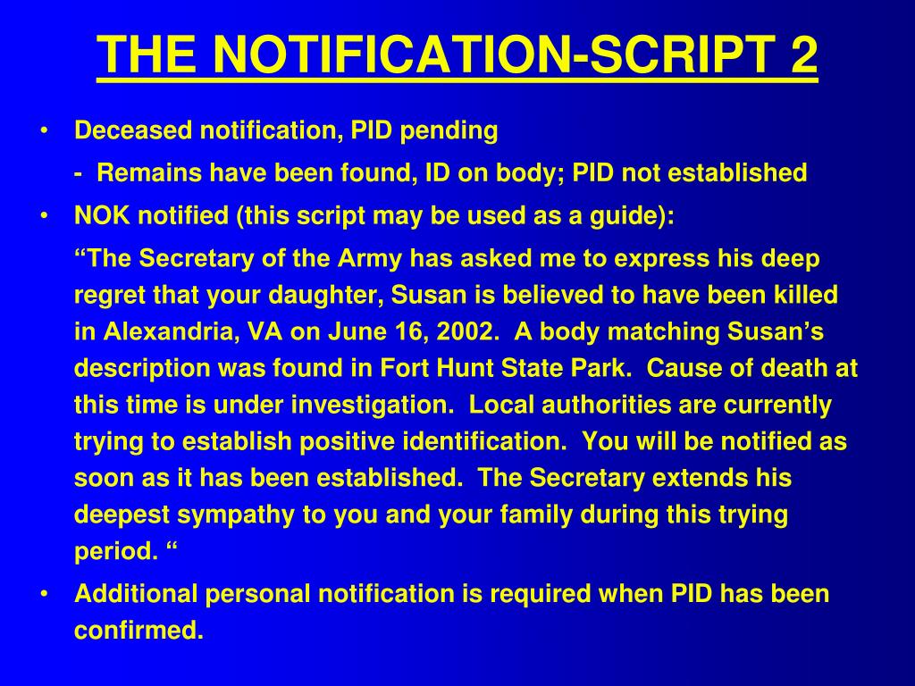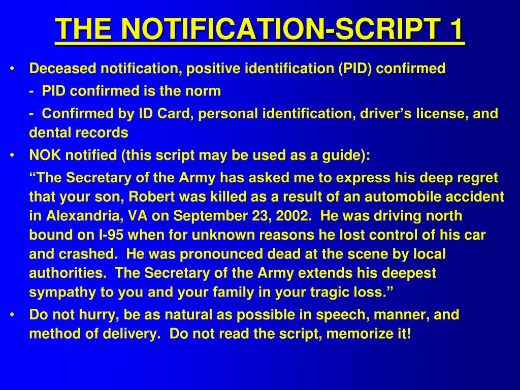 THE NOTIFICATION-SCRIPT 1 • Deceased notification, positive identification (PID) confirmed - PID confirmed is the norm - Confirmed by ID Card, personal identification, driver’s license, and dental records • NOK notified (this script may be used as a guide): “The Secretary of the Army has asked me to express his deep regret that your son, Robert was killed as a result of an automobile accident in Alexandria, VA on September 23, 2002. He was driving north bound on I-95 when for unknown reasons he lost control of his car and crashed. He was pronounced dead at the scene by local authorities. The Secretary of the Army extends his deepest sympathy to you and your family in your tragic loss.” • Do not hurry, be as natural as possible in speech, manner, and method of delivery. Do not read the script, memorize it!