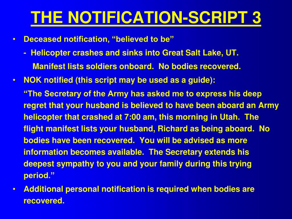 THE NOTIFICATION-SCRIPT 3 • Deceased notification, “believed to be” - Helicopter crashes and sinks into Great Salt Lake, UT. Manifest lists soldiers onboard. No bodies recovered. • NOK notified (this script may be used as a guide): “The Secretary of the Army has asked me to express his deep regret that your husband is believed to have been aboard an Army helicopter that crashed at 7:00 am, this morning in Utah. The flight manifest lists your husband, Richard as being aboard. No bodies have been recovered. You will be advised as more information becomes available. The Secretary extends his deepest sympathy to you and your family during this trying period.” • Additional personal notification is required when bodies are recovered.