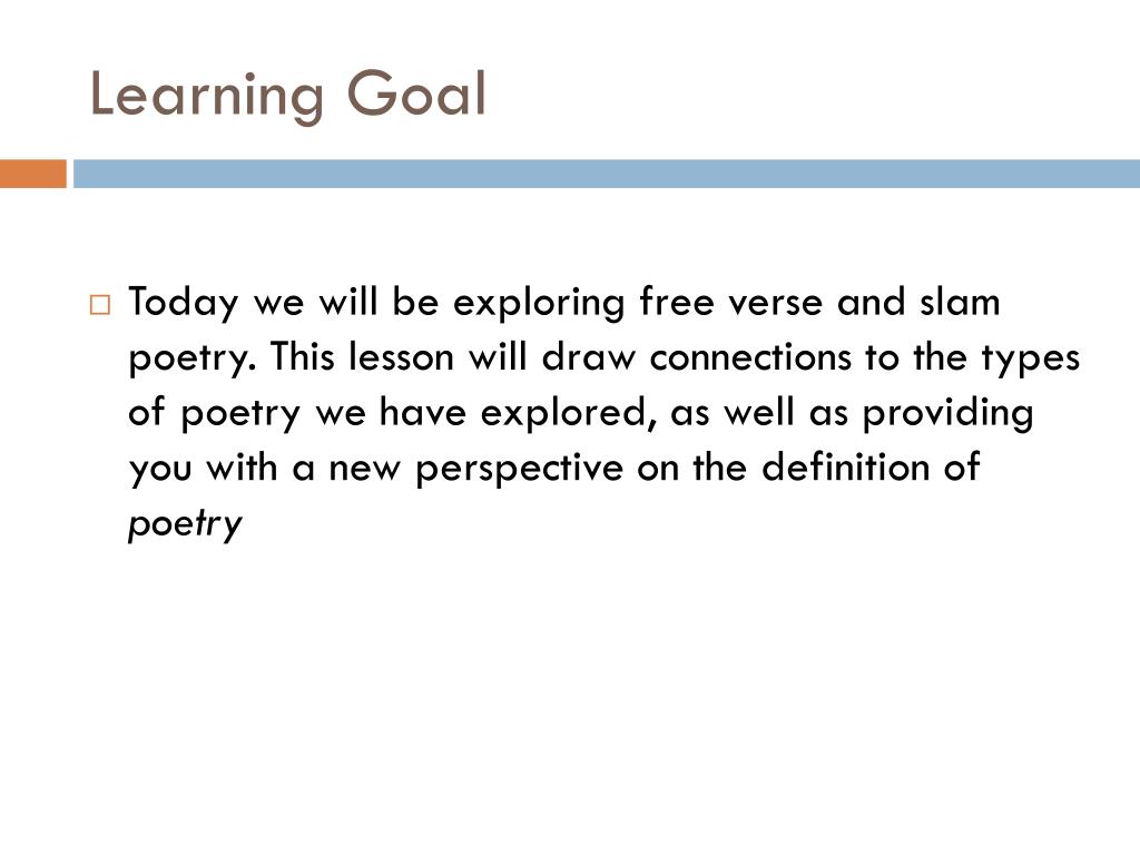 Free Verse, slam poetry. Learning Goal. Today we will be exploring free verse and slam poetry. This lesson will draw connections to the types of poetry we have explored, as well as providing you with a new perspective on the definition of poetry . Writing Free Verse Poetry.