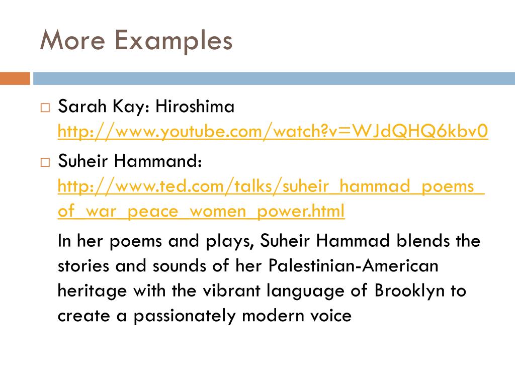 More Examples • Sarah Kay: Hiroshima http://www.youtube.com/watch?v=WJdQHQ6kbv0 • SuheirHammand: http://www.ted.com/talks/suheir_hammad_poems_of_war_peace_women_power.html In her poems and plays, SuheirHammad blends the stories and sounds of her Palestinian-American heritage with the vibrant language of Brooklyn to create a passionately modern voice