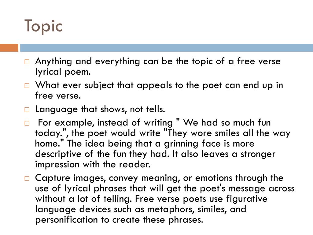 Topic • Anything and everything can be the topic of a free verse lyrical poem. • What ever subject that appeals to the poet can end up in free verse. • Language that shows, not tells. • For example, instead of writing " We had so much fun today.", the poet would write "They wore smiles all the way home." The idea being that a grinning face is more descriptive of the fun they had. It also leaves a stronger impression with the reader. • Capture images, convey meaning, or emotions through the use of lyrical phrases that will get the poet's message across without a lot of telling. Free verse poets use figurative language devices such as metaphors, similes, and personification to create these phrases.