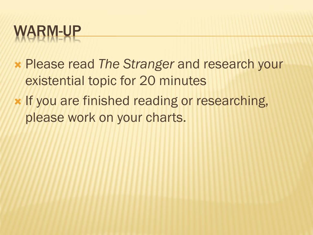Please read The Stranger and research your existential topic for 20 minutes If you are finished reading or researching, please work on your charts. Warm-Up