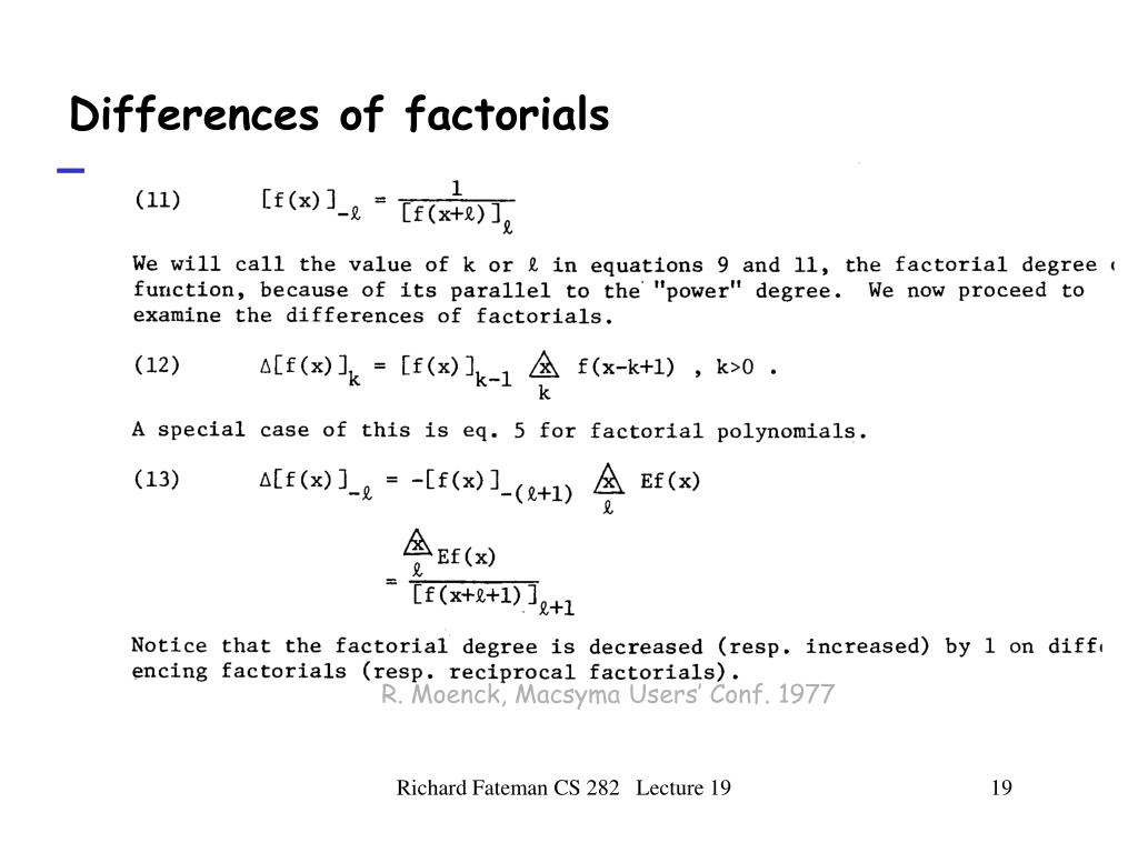 Differences of factorials R. Moenck, Macsyma Users’ Conf. 1977 Richard Fateman CS 282 Lecture 19
