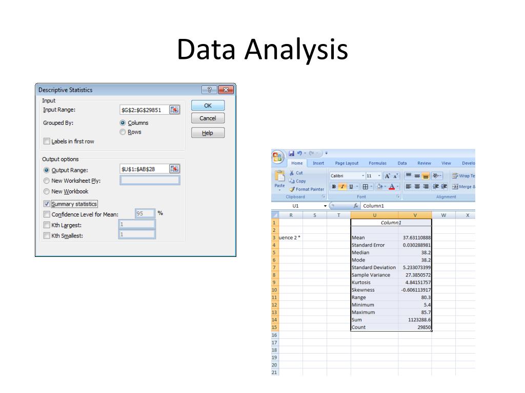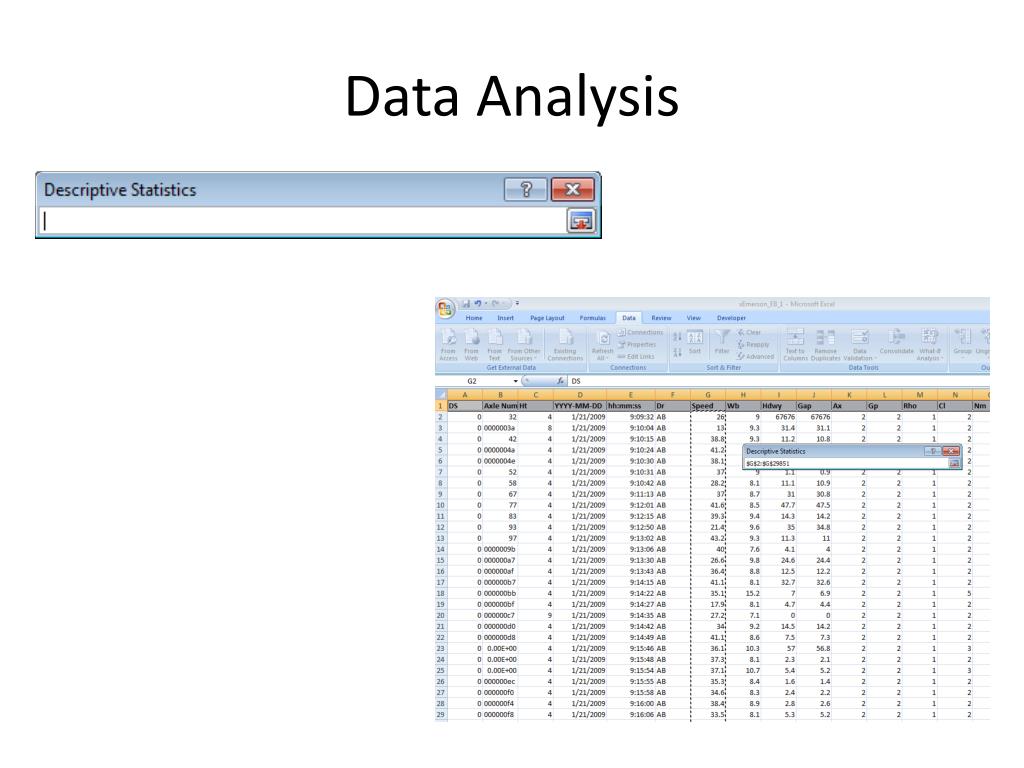 Data Analysis • Use Data Analysis to calculate Descriptive Statistics of the “Speed” column