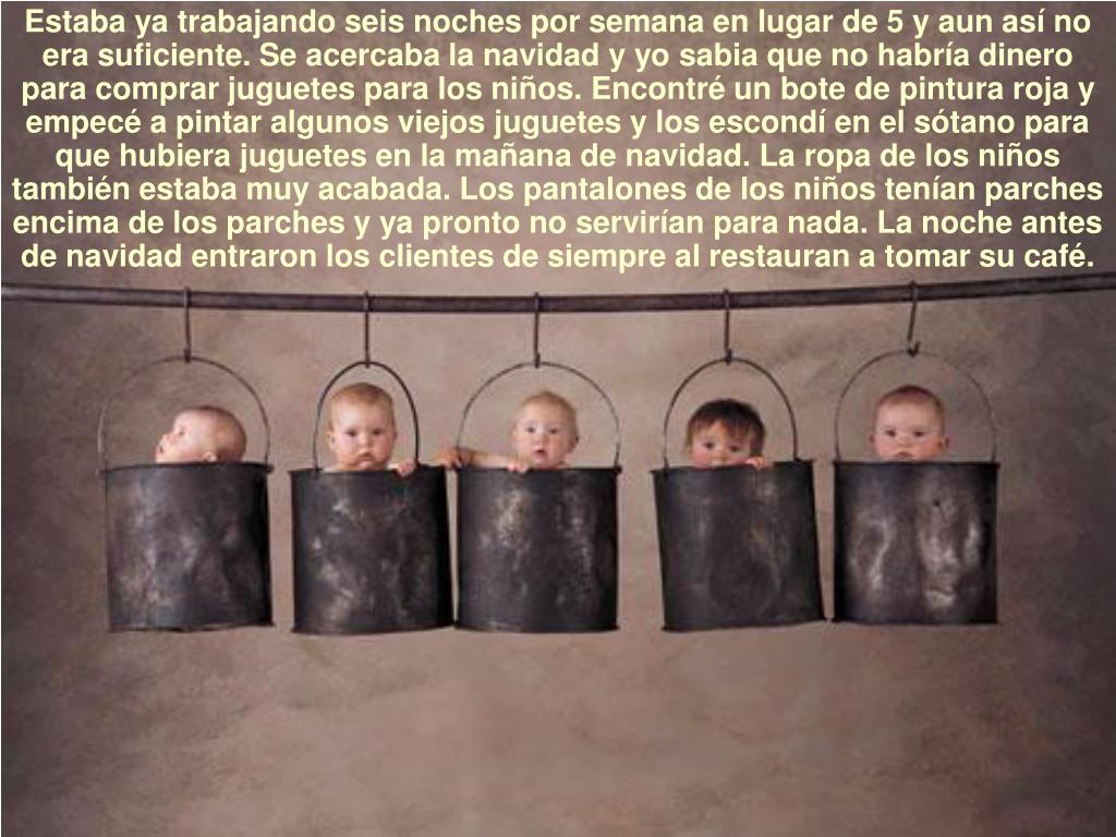 Estaba ya trabajando seis noches por semana en lugar de 5 y aun así no era suficiente. Se acercaba la navidad y yo sabia que no habría dinero para comprar juguetes para los niños. Encontré un bote de pintura roja y empecé a pintar algunos viejos juguetes y los escondí en el sótano para que hubiera juguetes en la mañana de navidad. La ropa de los niños también estaba muy acabada. Los pantalones de los niños tenían parches encima de los parches y ya pronto no servirían para nada. La noche antes de navidad entraron los clientes de siempre al restauran a tomar su café.