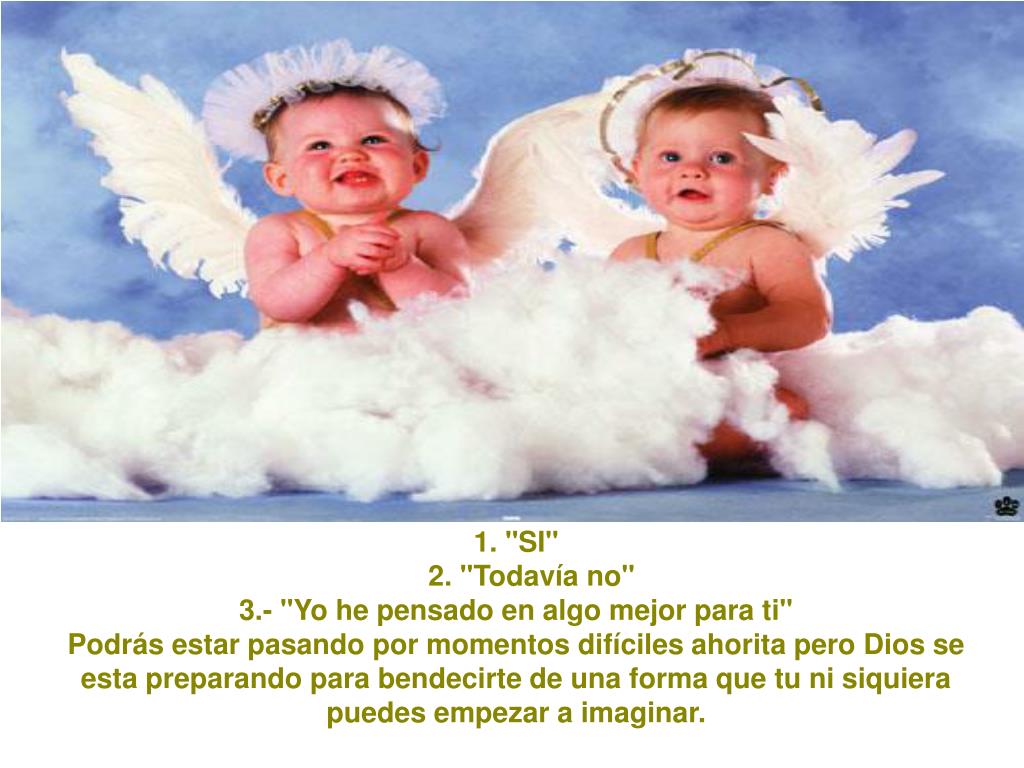 1. "SI" 2. "Todavía no"3.- "Yo he pensado en algo mejor para ti"Podrás estar pasando por momentos difíciles ahorita pero Dios se esta preparando para bendecirte de una forma que tu ni siquiera puedes empezar a imaginar.