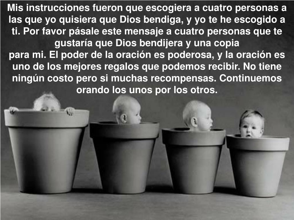 Mis instrucciones fueron que escogiera a cuatro personas a las que yo quisiera que Dios bendiga, y yo te he escogido a ti. Por favor pásale este mensaje a cuatro personas que te gustaría que Dios bendijera y una copiapara mi. El poder de la oración es poderosa, y la oración es uno de los mejores regalos que podemos recibir. No tiene ningún costo pero si muchas recompensas. Continuemos orando los unos por los otros.