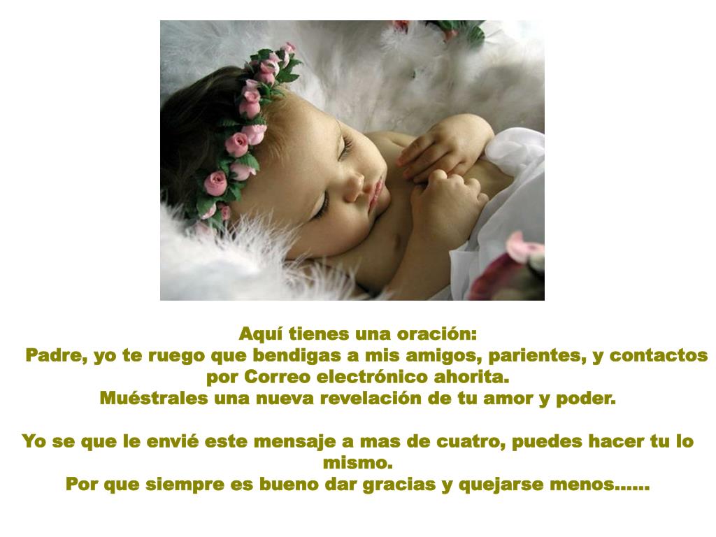 Aquí tienes una oración: Padre, yo te ruego que bendigas a mis amigos, parientes, y contactos por Correo electrónico ahorita. Muéstrales una nueva revelación de tu amor y poder. Yo se que le envié este mensaje a mas de cuatro, puedes hacer tu lo mismo.Por que siempre es bueno dar gracias y quejarse menos......