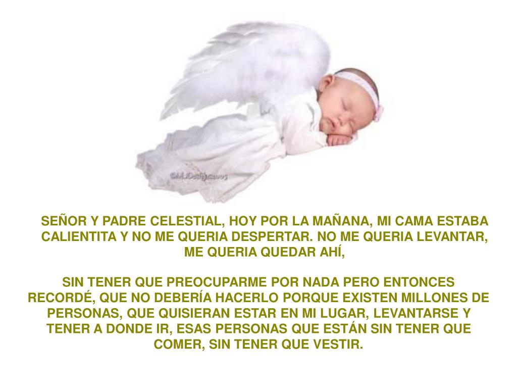 SEÑOR Y PADRE CELESTIAL, HOY POR LA MAÑANA, MI CAMA ESTABA CALIENTITA Y NO ME QUERIA DESPERTAR. NO ME QUERIA LEVANTAR, ME QUERIA QUEDAR AHÍ, SIN TENER QUE PREOCUPARME POR NADA PERO ENTONCES RECORDÉ, QUE NO DEBERÍA HACERLO PORQUE EXISTEN MILLONES DE PERSONAS, QUE QUISIERAN ESTAR EN MI LUGAR, LEVANTARSE Y TENER A DONDE IR, ESAS PERSONAS QUE ESTÁN SIN TENER QUE COMER, SIN TENER QUE VESTIR.