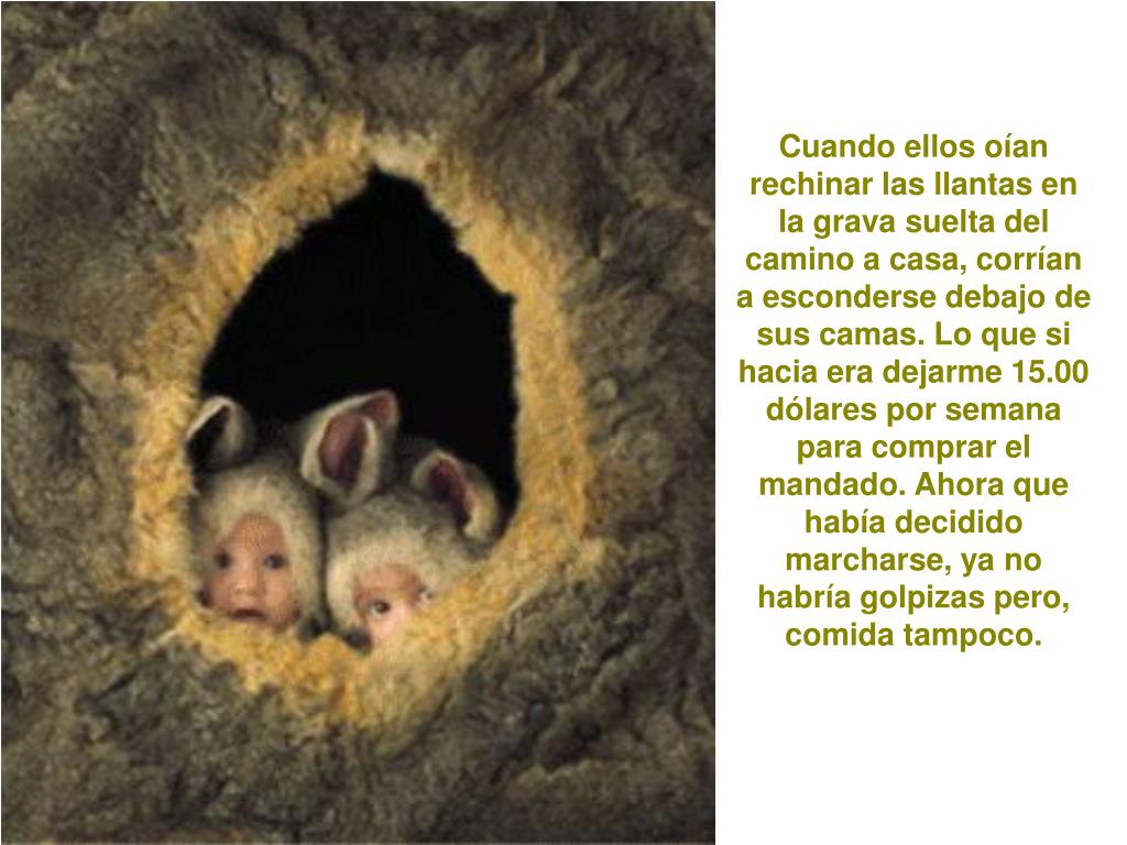 Cuando ellos oían rechinar las llantas en la grava suelta del camino a casa, corrían a esconderse debajo de sus camas. Lo que si hacia era dejarme 15.00 dólares por semana para comprar el mandado. Ahora que había decidido marcharse, ya no habría golpizas pero, comida tampoco.