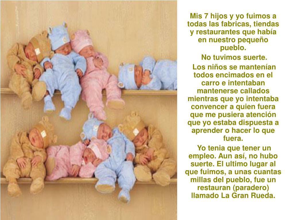 UNA HERMOSA HISTORIA. En septiembre de 1960. Yo desperté una mañana con 6 bebes hambrientos y solo 0.75 centavos en mi bolsa. Su papa se había ido. Los niños tenían de tres meses a 7 años. Su papa nunca había sido mas que una presencia que ellos temían.