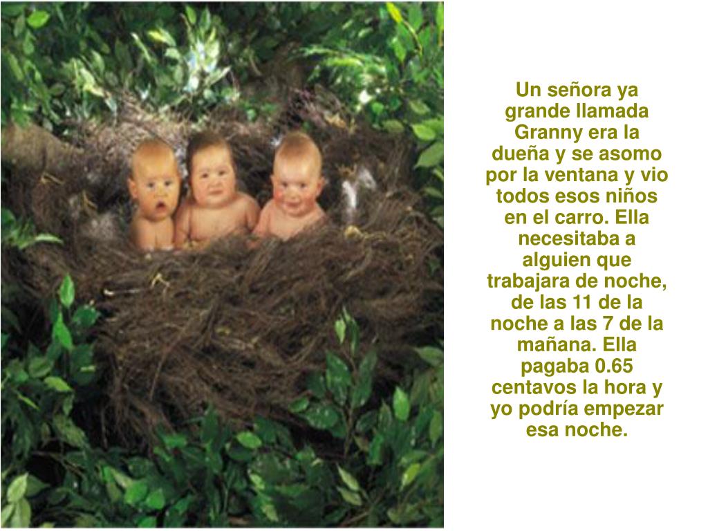 Un señora ya grande llamada Granny era la dueña y se asomo por la ventana y vio todos esos niños en el carro. Ella necesitaba a alguien que trabajara de noche, de las 11 de la noche a las 7 de la mañana. Ella pagaba 0.65 centavos la hora y yo podría empezar esa noche.