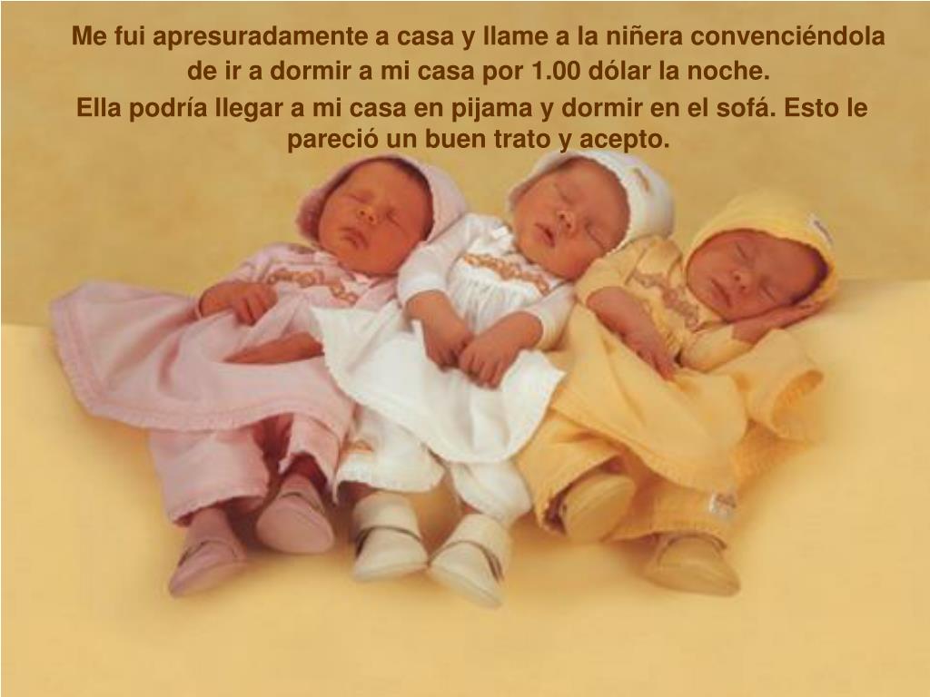 Me fui apresuradamente a casa y llame a la niñera convenciéndola de ir a dormir a mi casa por 1.00 dólar la noche. Ella podría llegar a mi casa en pijama y dormir en el sofá. Esto le pareció un buen trato y acepto.