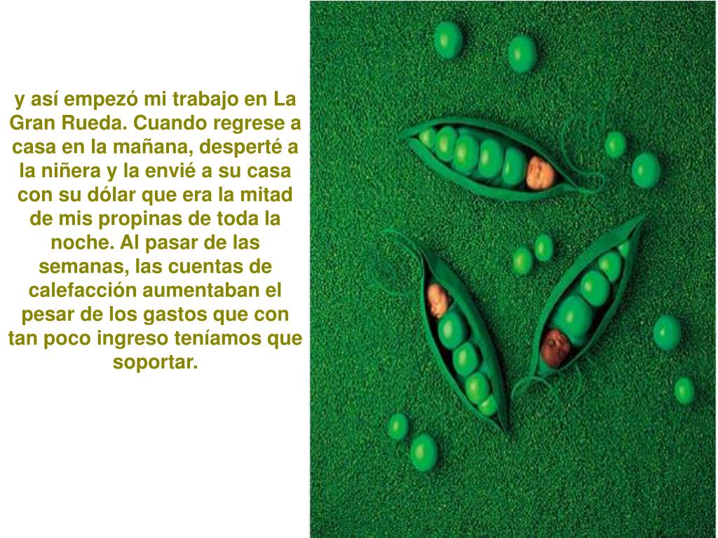 y así empezó mi trabajo en La Gran Rueda. Cuando regrese a casa en la mañana, desperté a la niñera y la envié a su casa con su dólar que era la mitad de mis propinas de toda la noche. Al pasar de las semanas, las cuentas de calefacción aumentaban el pesar de los gastos que con tan poco ingreso teníamos que soportar.