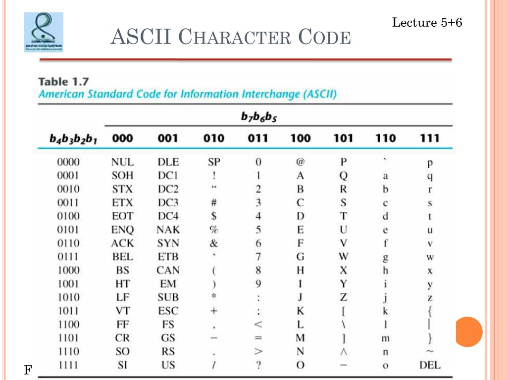 ASCII Character Code • American Standard Code for Information Interchange (Refer to Table 1.7) • A popular code used to represent information sent as • character-based data. • It uses 7-bits to represent: • 94 Graphic printing characters. • 34 Non-printing characters • Some non-printing characters are used for text format (e.g. BS = Backspace, CR = carriage return) • Other non-printing characters are used for record marking and flow control (e.g. STX and ETX start and end text areas).