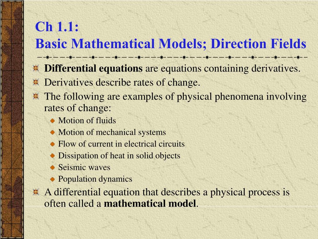 Ch 1.1: Basic Mathematical Models; Direction Fields • Differential equations are equations containing derivatives. • Derivatives describe rates of change. • The following are examples of physical phenomena involving rates of change: • Motion of fluids • Motion of mechanical systems • Flow of current in electrical circuits • Dissipation of heat in solid objects • Seismic waves • Population dynamics • A differential equation that describes a physical process is often called a mathematical model.