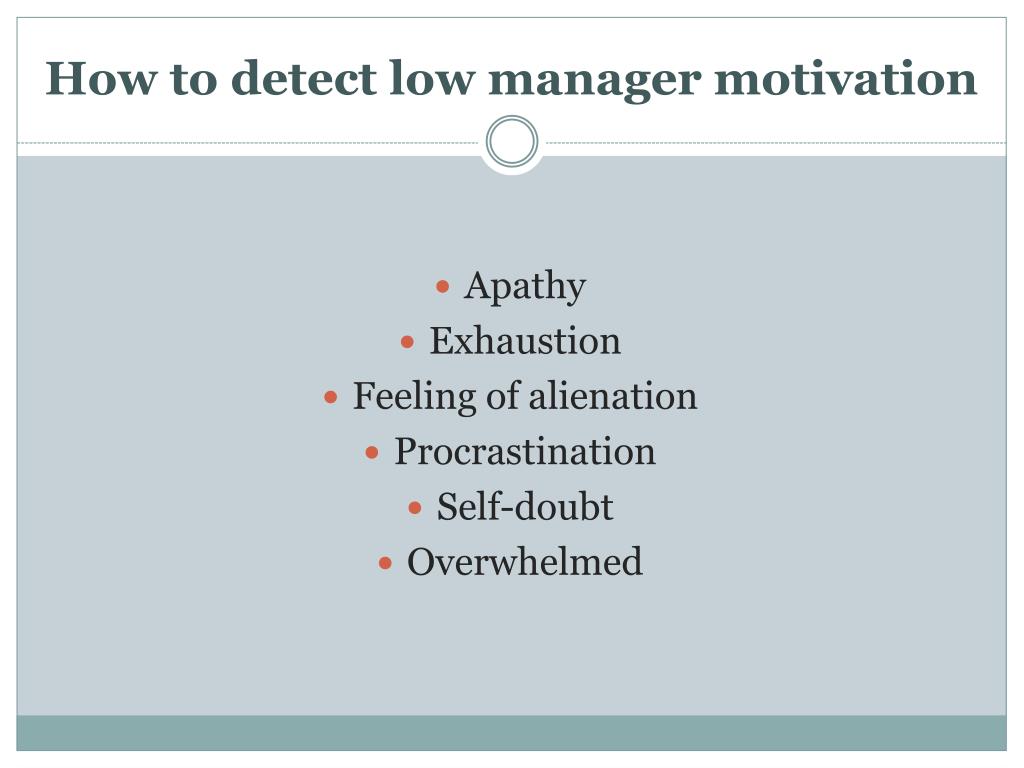 How to detect low manager motivation Apathy Exhaustion Feeling of alienation Procrastination Self-doubt Overwhelmed