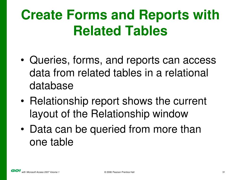 Create Forms and Reports with Related Tables • Queries, forms, and reports can access data from related tables in a relational database • Relationship report shows the current layout of the Relationship window • Data can be queried from more than one table