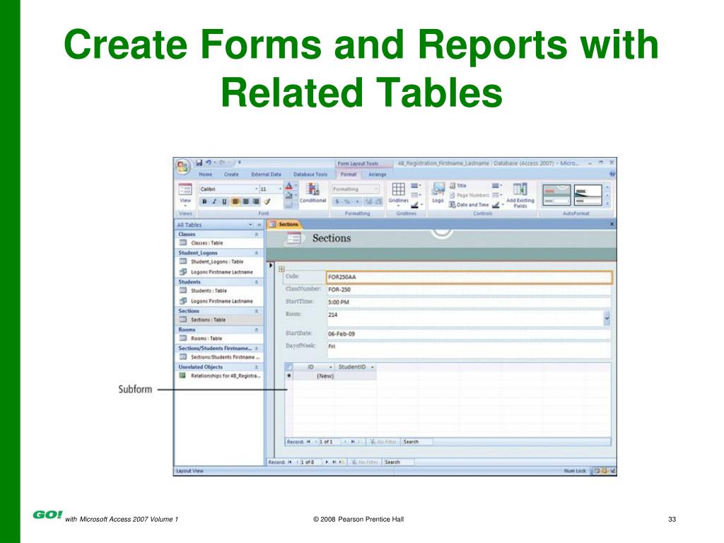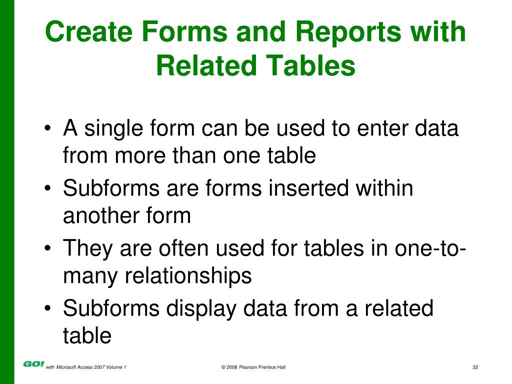 Create Forms and Reports with Related Tables • A single form can be used to enter data from more than one table • Subforms are forms inserted within another form • They are often used for tables in one-to-many relationships • Subforms display data from a related table
