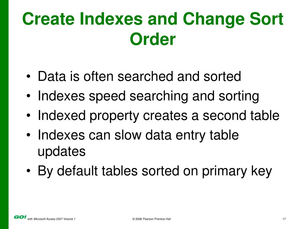 Create Indexes and Change Sort Order • Data is often searched and sorted • Indexes speed searching and sorting • Indexed property creates a second table • Indexes can slow data entry table updates • By default tables sorted on primary key
