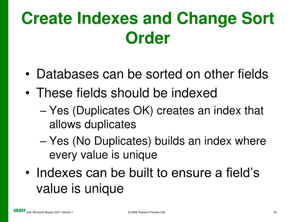 Create Indexes and Change Sort Order • Databases can be sorted on other fields • These fields should be indexed • Yes (Duplicates OK) creates an index that allows duplicates • Yes (No Duplicates) builds an index where every value is unique • Indexes can be built to ensure a field’s value is unique