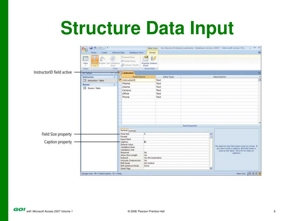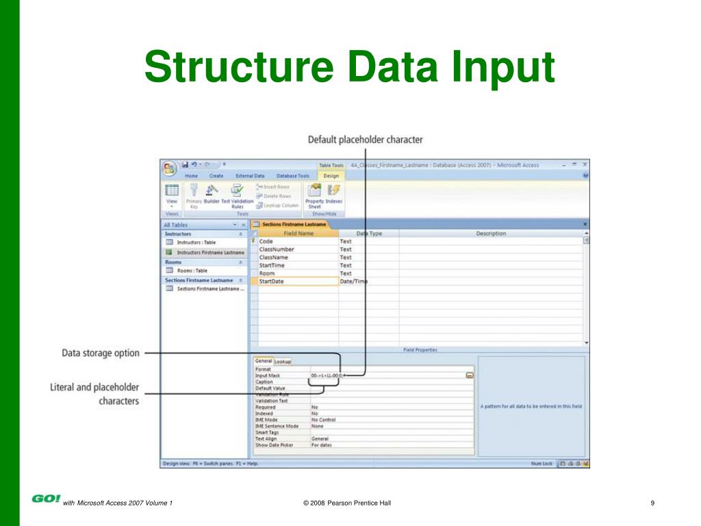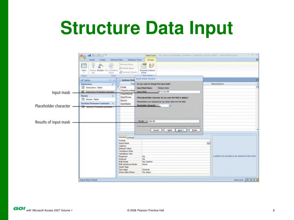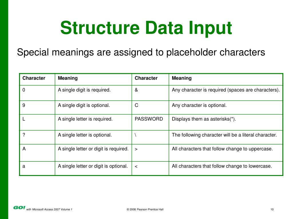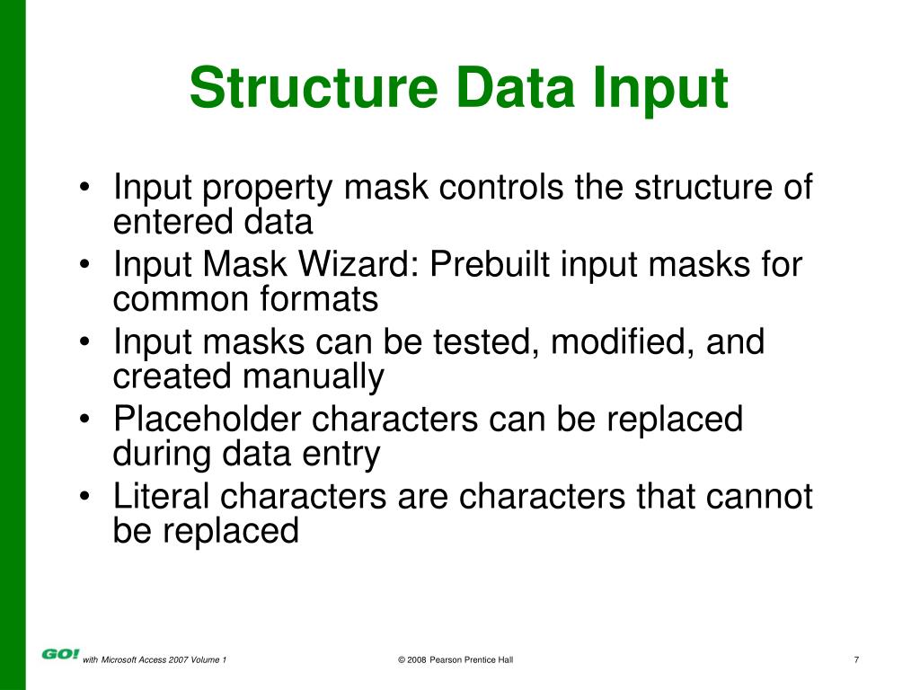 Structure Data Input • Input property mask controls the structure of entered data • Input Mask Wizard: Prebuilt input masks for common formats • Input masks can be tested, modified, and created manually • Placeholder characters can be replaced during data entry • Literal characters are characters that cannot be replaced