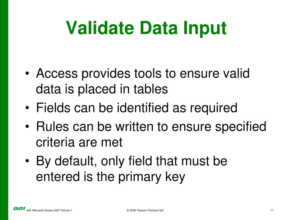 Validate Data Input • Access provides tools to ensure valid data is placed in tables • Fields can be identified as required • Rules can be written to ensure specified criteria are met • By default, only field that must be entered is the primary key