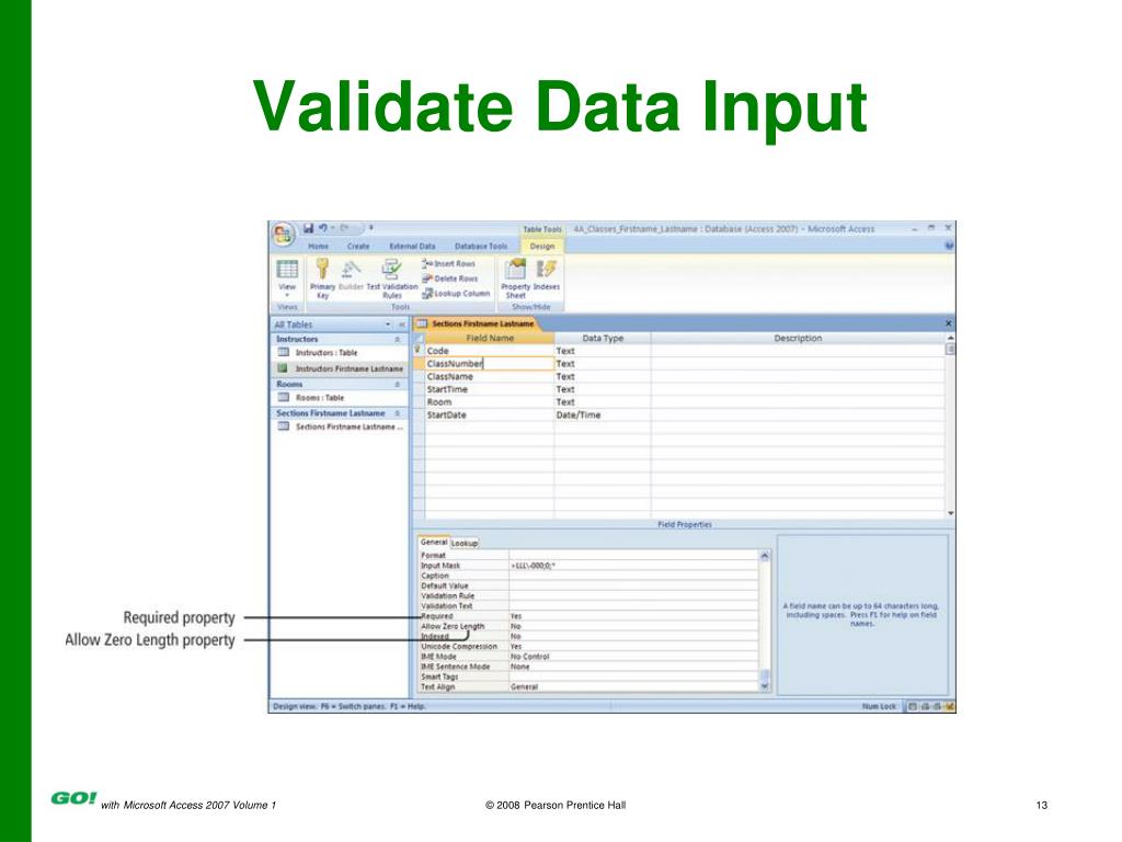 Validate Data Input • If field’s Required property is set to Yes, that field must contain an entry • Allow Zero Length property determines if an entry can have zero characters • Set to No the field is required