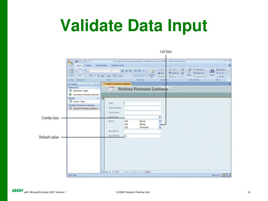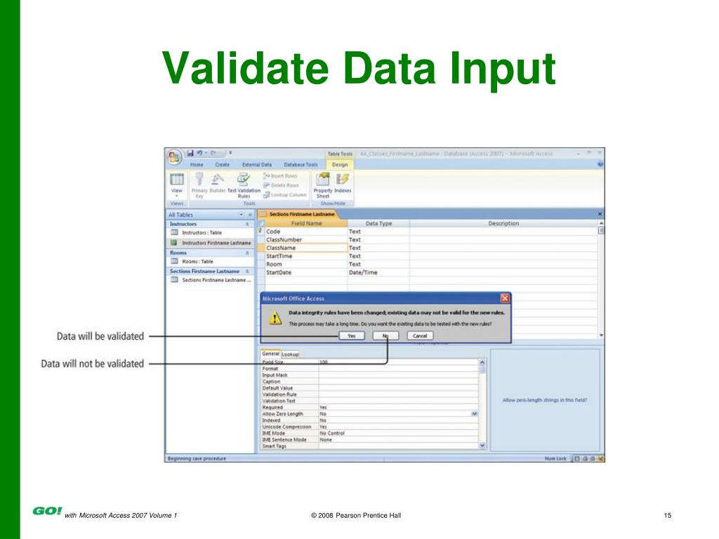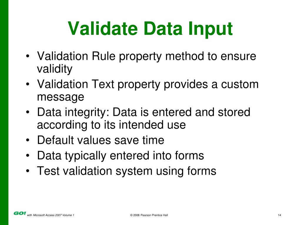 Validate Data Input • Validation Rule property method to ensure validity • Validation Text property provides a custom message • Data integrity: Data is entered and stored according to its intended use • Default values save time • Data typically entered into forms • Test validation system using forms