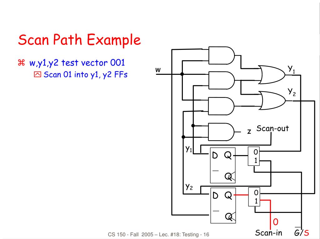w,y1,y2 test vector 001 Scan 01 into y1, y2 FFs Q Q D D Q Q G/S Scan Path Example Y1 Y2 w Scan-out z y1 y2 0 1 0 1 0 CS 150 - Fall 2005 – Lec. #18: Testing - 16 Scan-in