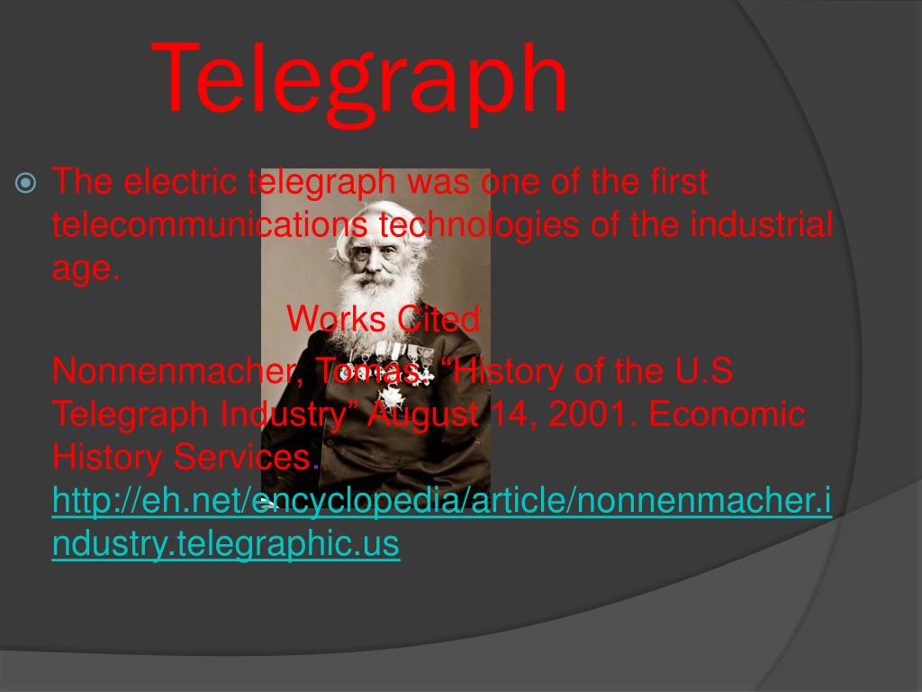 Telegraph • The electric telegraph was one of the first telecommunications technologies of the industrial age. Works Cited Nonnenmacher, Tomas. “History of the U.S Telegraph Industry” August 14, 2001. Economic History Services. http://eh.net/encyclopedia/article/nonnenmacher.industry.telegraphic.us
