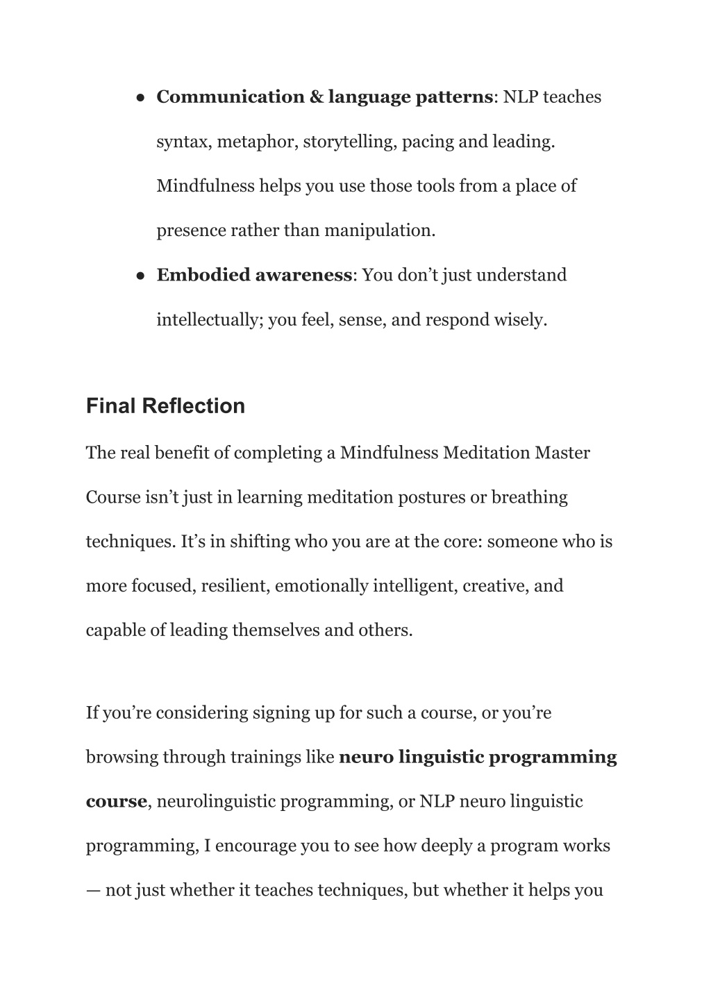 ● Communication & language patterns: NLP teaches syntax, metaphor, storytelling, pacing and leading. Mindfulness helps you use those tools from a place of presence rather than manipulation. ● Embodied awareness: You don’t just understand intellectually; you feel, sense, and respond wisely. Final Reflection The real benefit of completing a Mindfulness Meditation Master Course isn’t just in learning meditation postures or breathing techniques. It’s in shifting who you are at the core: someone who is more focused, resilient, emotionally intelligent, creative, and capable of leading themselves and others. If you’re considering signing up for such a course, or you’re browsing through trainings like neuro linguistic programming course, neurolinguistic programming, or NLP neuro linguistic programming, I encourage you to see how deeply a program works — not just whether it teaches techniques, but whether it helps you