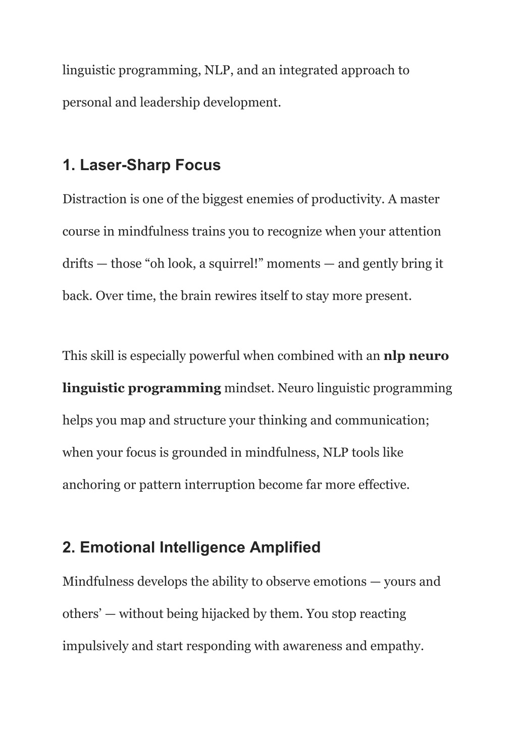 linguistic programming, NLP, and an integrated approach to personal and leadership development. 1. Laser-Sharp Focus Distraction is one of the biggest enemies of productivity. A master course in mindfulness trains you to recognize when your attention drifts — those “oh look, a squirrel!” moments — and gently bring it back. Over time, the brain rewires itself to stay more present. This skill is especially powerful when combined with an nlp neuro linguistic programming mindset. Neuro linguistic programming helps you map and structure your thinking and communication; when your focus is grounded in mindfulness, NLP tools like anchoring or pattern interruption become far more effective. 2. Emotional Intelligence Amplified Mindfulness develops the ability to observe emotions — yours and others’ — without being hijacked by them. You stop reacting impulsively and start responding with awareness and empathy.