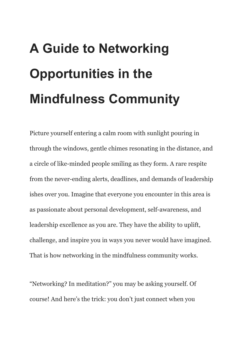 A Guide to Networking Opportunities in the Mindfulness Community Picture yourself entering a calm room with sunlight pouring in through the windows, gentle chimes resonating in the distance, and a circle of like-minded people smiling as they form. A rare respite from the never-ending alerts, deadlines, and demands of leadership ishes over you. Imagine that everyone you encounter in this area is as passionate about personal development, self-awareness, and leadership excellence as you are. They have the ability to uplift, challenge, and inspire you in ways you never would have imagined. That is how networking in the mindfulness community works. “Networking? In meditation?” you may be asking yourself. Of course! And here’s the trick: you don’t just connect when you