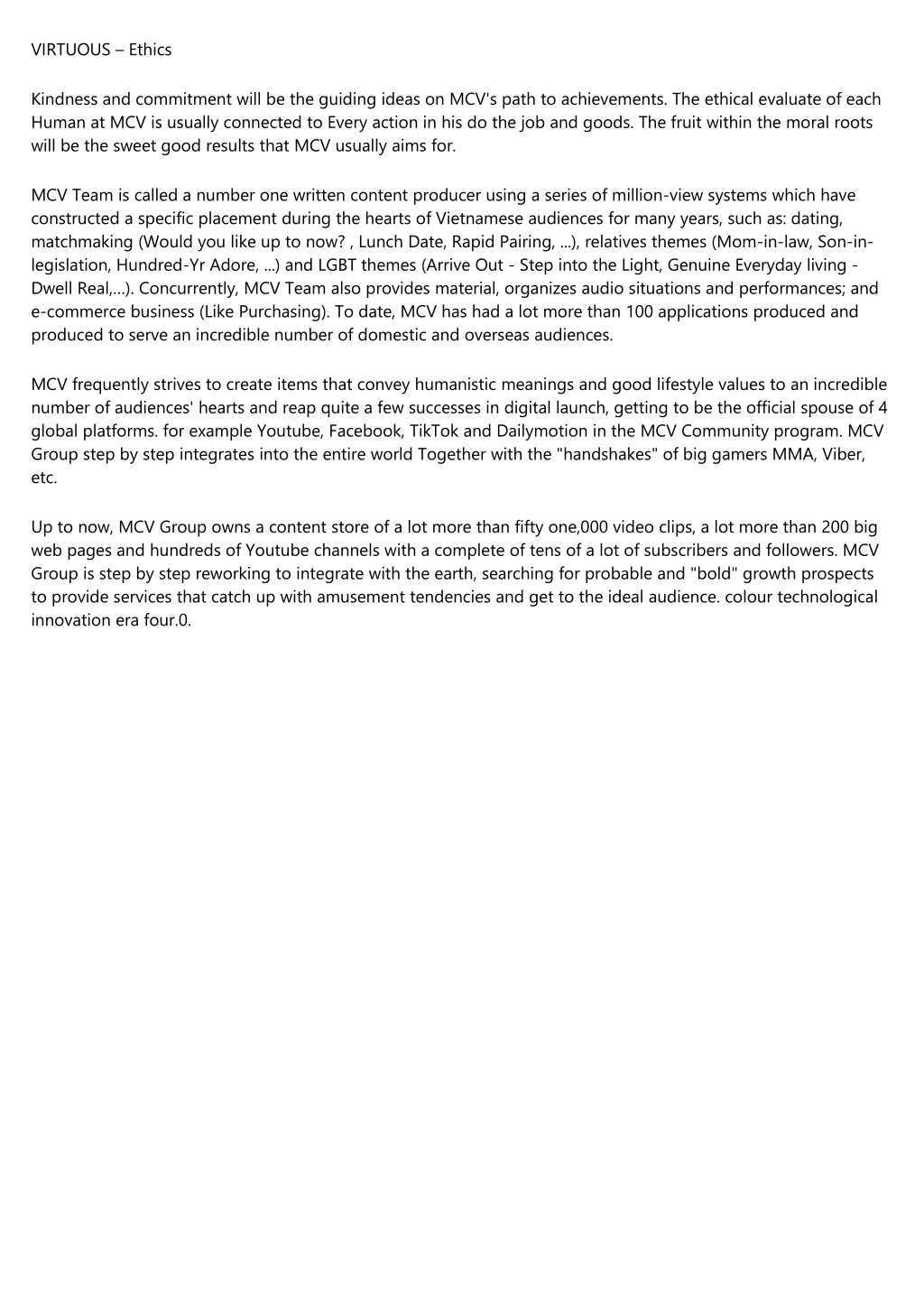 VIRTUOUS – Ethics Kindness and commitment will be the guiding ideas on MCV's path to achievements. The ethical evaluate of each Human at MCV is usually connected to Every action in his do the job and goods. The fruit within the moral roots will be the sweet good results that MCV usually aims for. MCV Team is called a number one written content producer using a series of million-view systems which have constructed a specific placement during the hearts of Vietnamese audiences for many years, such as: dating, matchmaking (Would you like up to now? , Lunch Date, Rapid Pairing, ...), relatives themes (Mom-in-law, Son-in- legislation, Hundred-Yr Adore, ...) and LGBT themes (Arrive Out - Step into the Light, Genuine Everyday living - Dwell Real,…). Concurrently, MCV Team also provides material, organizes audio situations and performances; and e-commerce business (Like Purchasing). To date, MCV has had a lot more than 100 applications produced and produced to serve an incredible number of domestic and overseas audiences. MCV frequently strives to create items that convey humanistic meanings and good lifestyle values to an incredible number of audiences' hearts and reap quite a few successes in digital launch, getting to be the official spouse of 4 global platforms. for example Youtube, Facebook, TikTok and Dailymotion in the MCV Community program. MCV Group step by step integrates into the entire world Together with the "handshakes" of big gamers MMA, Viber, etc. Up to now, MCV Group owns a content store of a lot more than fifty one,000 video clips, a lot more than 200 big web pages and hundreds of Youtube channels with a complete of tens of a lot of subscribers and followers. MCV Group is step by step reworking to integrate with the earth, searching for probable and "bold" growth prospects to provide services that catch up with amusement tendencies and get to the ideal audience. colour technological innovation era four.0.