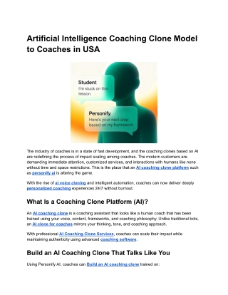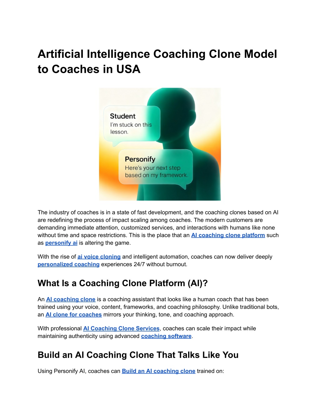 Artificial Intelligence Coaching Clone Model to Coaches in USA The industry of coaches is in a state of fast development, and the coaching clones based on AI are redefining the process of impact scaling among coaches. The modern customers are demanding immediate attention, customized services, and interactions with humans like none without time and space restrictions. This is the place that an AI coaching clone platform such as personify ai is altering the game. With the rise of ai voice cloning and intelligent automation, coaches can now deliver deeply personalized coaching experiences 24/7 without burnout. What Is a Coaching Clone Platform (AI)? An AI coaching clone is a coaching assistant that looks like a human coach that has been trained using your voice, content, frameworks, and coaching philosophy. Unlike traditional bots, an AI clone for coaches mirrors your thinking, tone, and coaching approach. With professional AI Coaching Clone Services, coaches can scale their impact while maintaining authenticity using advanced coaching software. Build an AI Coaching Clone That Talks Like You Using Personify AI, coaches can Build an AI coaching clone trained on: