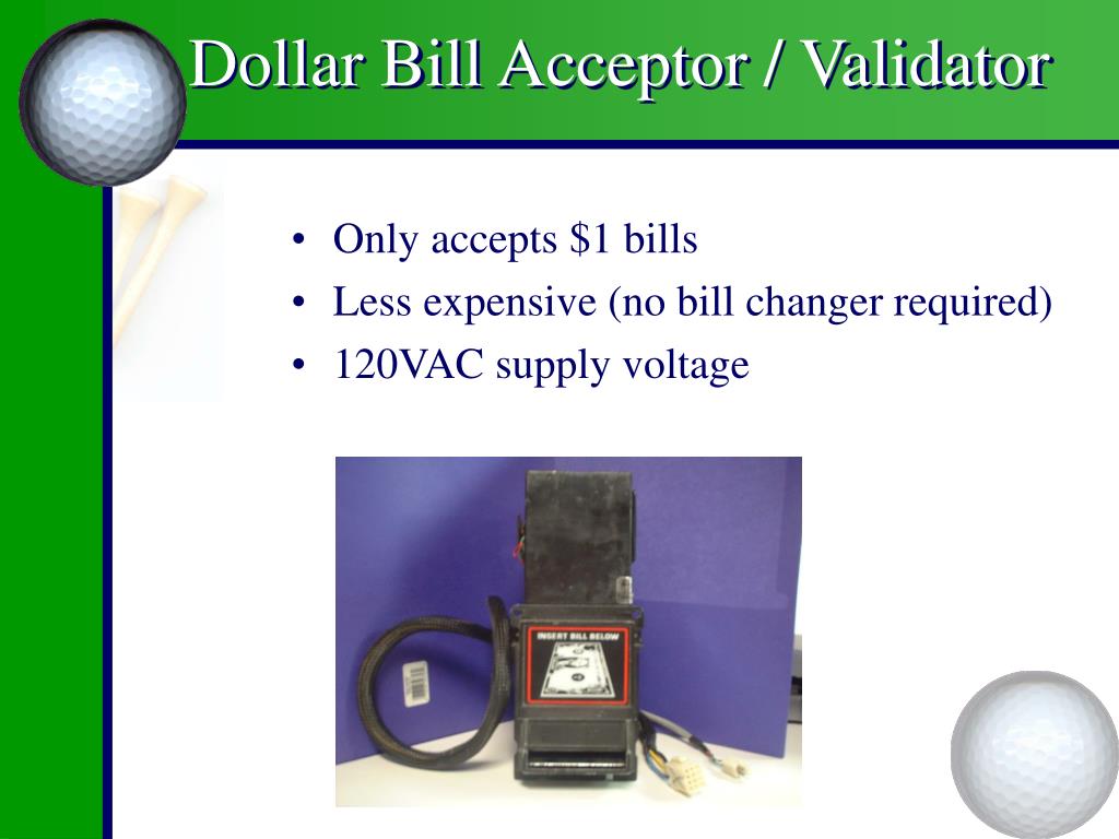 Dollar Bill Acceptor / Validator • Only accepts $1 bills • Less expensive (no bill changer required) • 120VAC supply voltage