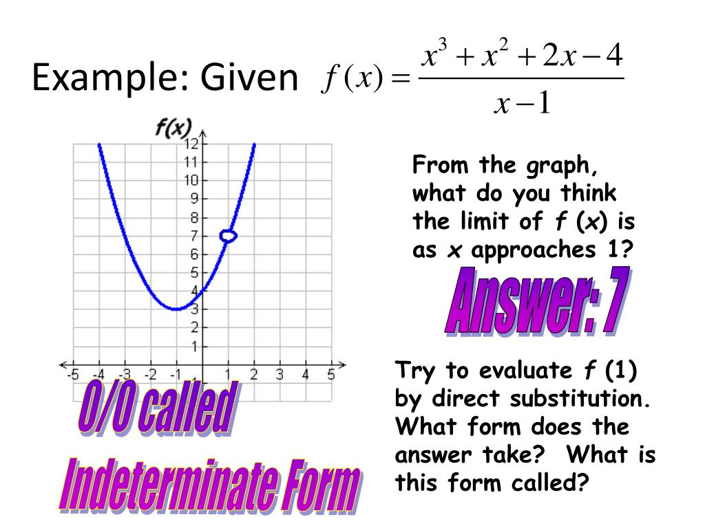 Example: Given From the graph, what do you think the limit of f (x) is as x approaches 1? Answer: 7 0/0 called Indeterminate Form Try to evaluate f (1) by direct substitution. What form does the answer take? What is this form called?