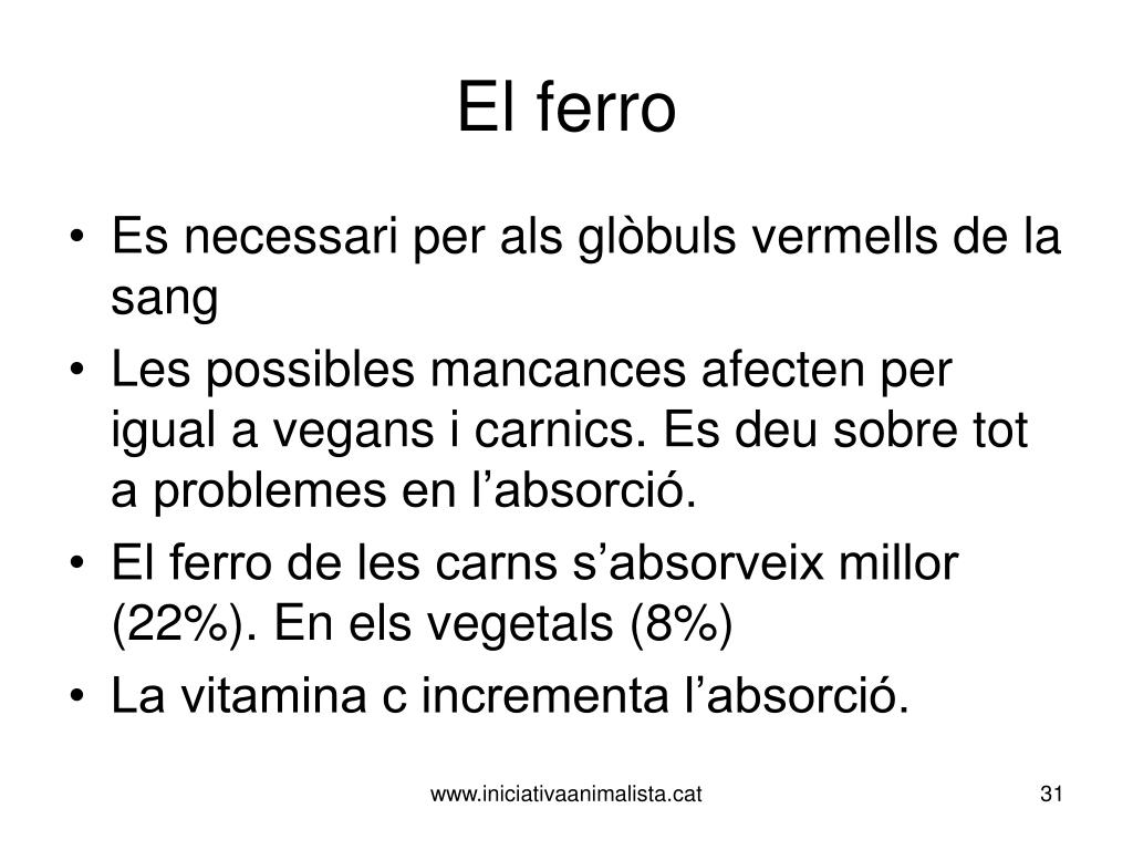 El ferro • Es necessari per als glòbuls vermells de la sang • Les possibles mancances afecten per igual a vegans i carnics. Es deu sobre tot a problemes en l’absorció. • El ferro de les carns s’absorveix millor (22%). En els vegetals (8%) • La vitamina c incrementa l’absorció. www.iniciativaanimalista.cat