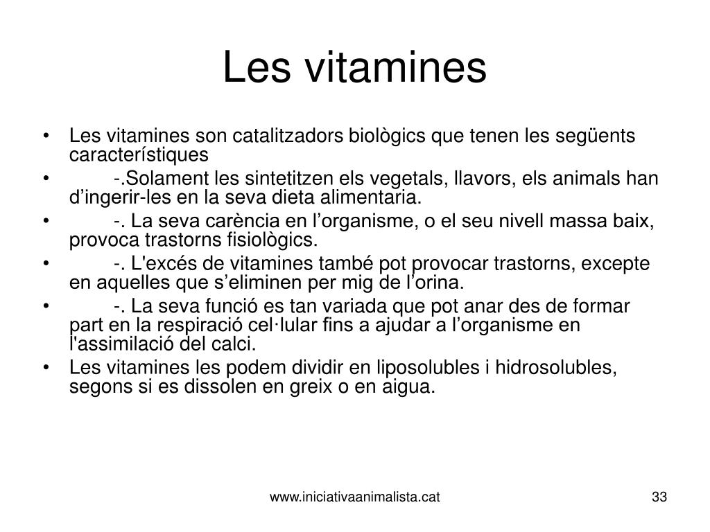 Les vitamines • Les vitamines son catalitzadors biològics que tenen les següents característiques • -.Solament les sintetitzen els vegetals, llavors, els animals han d’ingerir-les en la seva dieta alimentaria. • -. La seva carència en l’organisme, o el seu nivell massa baix, provoca trastorns fisiològics. • -. L'excés de vitamines també pot provocar trastorns, excepte en aquelles que s’eliminen per mig de l’orina. • -. La seva funció es tan variada que pot anar des de formar part en la respiració cel·lular fins a ajudar a l’organisme en l'assimilació del calci. • Les vitamines les podem dividir en liposolubles i hidrosolubles, segons si es dissolen en greix o en aigua. www.iniciativaanimalista.cat
